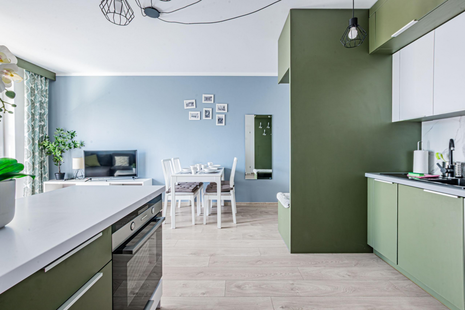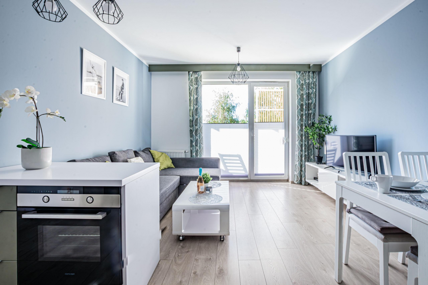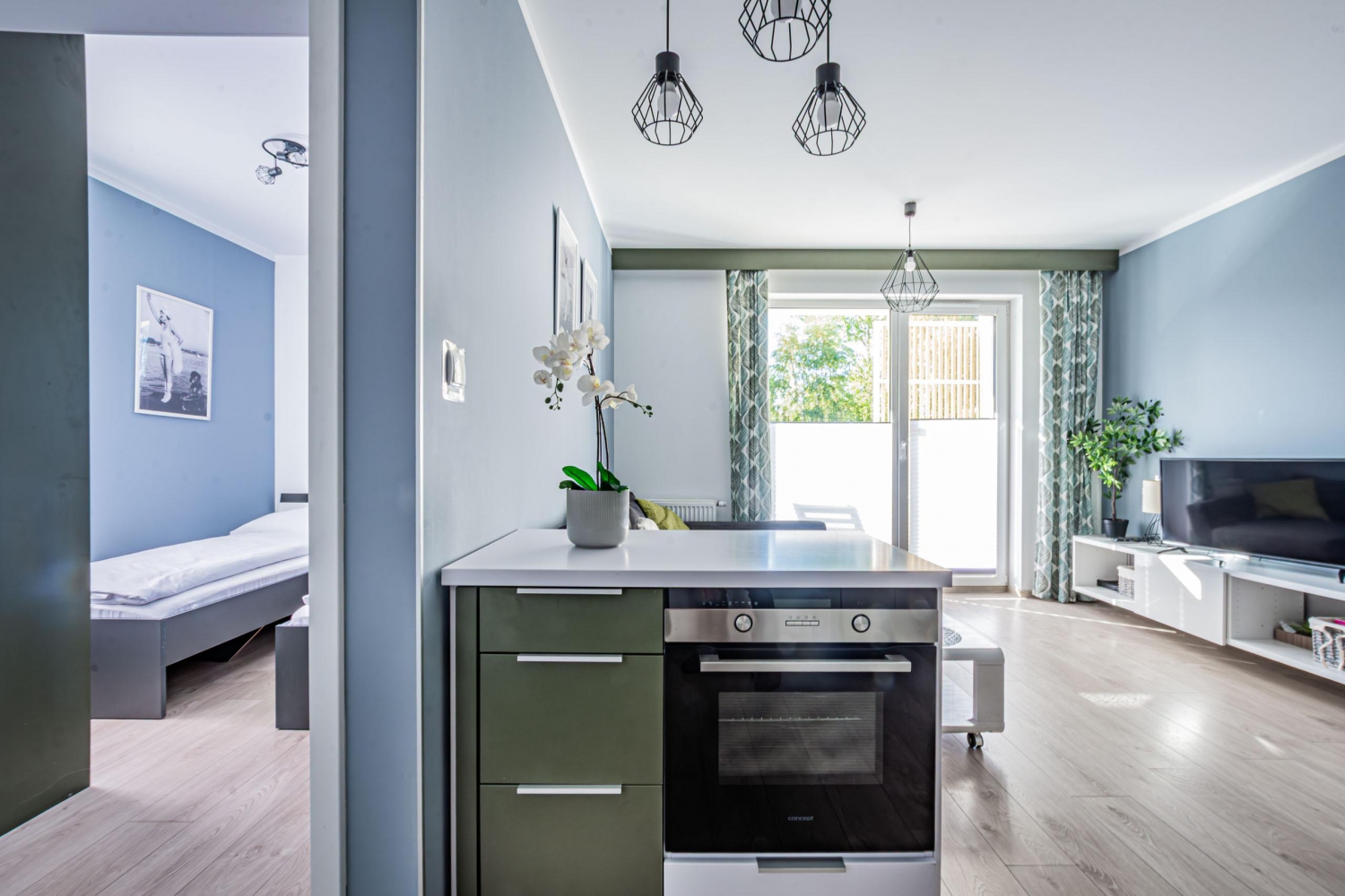 W apartamencie znajduje się aneks kuchenny przystosowany do przygotowywania codziennych posiłków. Do dyspozycji naszych Gości oddajemy lodówkę, piekarnik, zmywarkę, komplet naczyń – w tym kieliszki do wina, sztućce i akcesoria kuchenne. Wszystko, czego potrzebujesz, by samodzielnie przygotowywać posiłki i cieszyć się wspólnymi chwilami z bliskimi. Na wyposażeniu znajdują się także plastikowe naczynia dla dzieci.