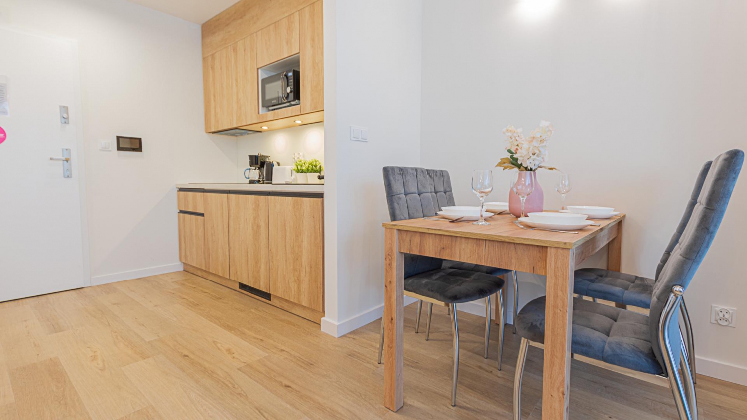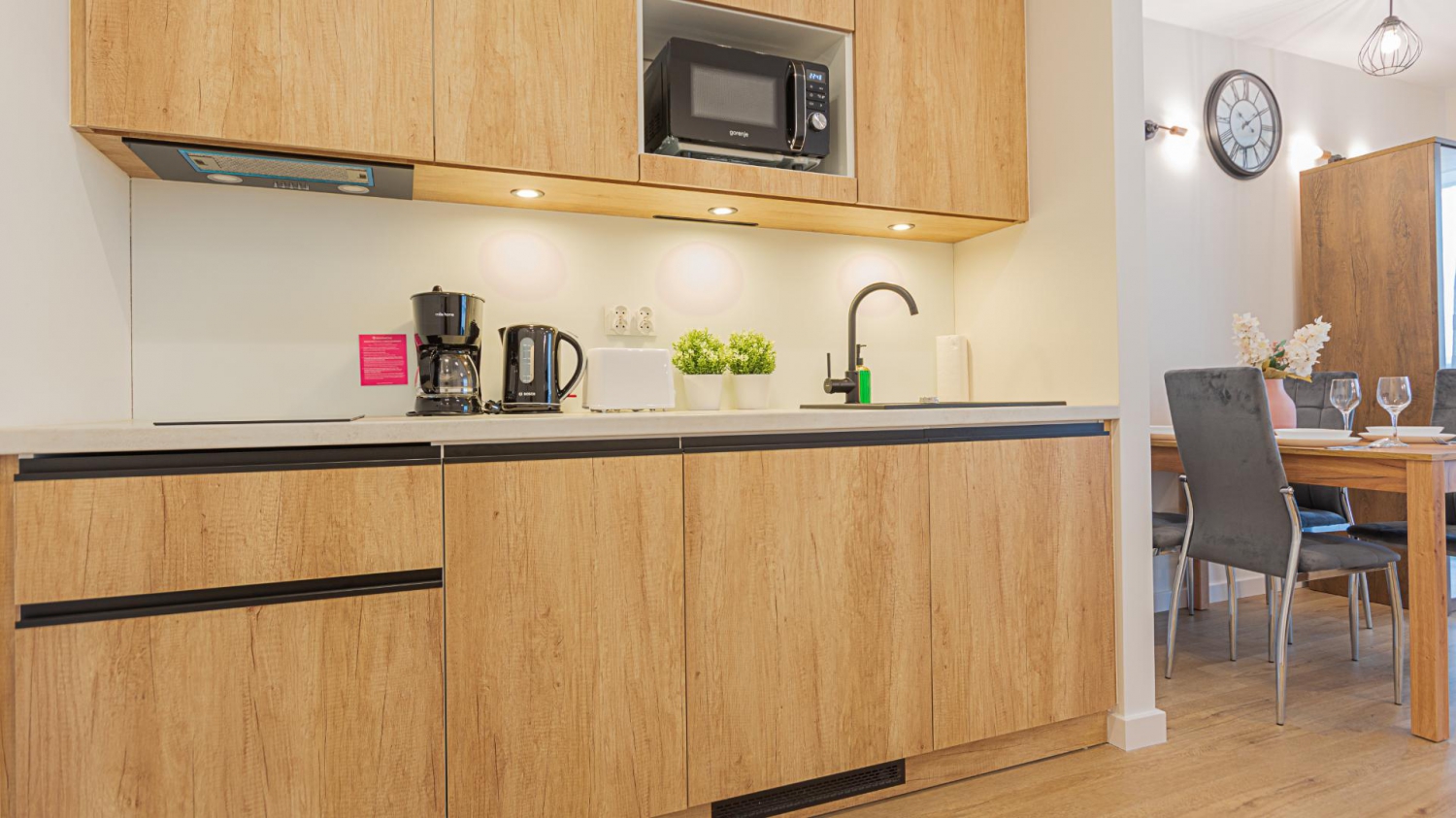 W apartamencie znajduje się aneks kuchenny przystosowany do zaspokajania codziennych potrzeb. Do dyspozycji Gości są sprzęty AGD m.in. lodówka, płyta elektryczna z okapem oraz komplet naczyń, sztućce, akcesoria kuchenne, szklanki i kieliszki do wina. Wszystko, co potrzebne by samodzielnie przygotować posiłki i cieszyć się wspólnymi chwilami z bliskimi.