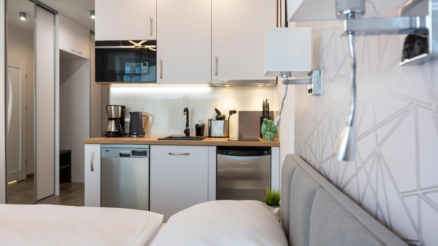 W apartamencie znajduje się w pełni wyposażony aneks kuchenny. Do dyspozycji Gości jest lodówka, zmywarka, płyta grzewcza, kuchenka mikrofalowa, ekspres do kawy, toster oraz komplet naczyń wraz z zestawem narzędzi kuchennych potrzebnych do wspólnego biesiadowania również na słonecznym tarasie słuchając szumu morza.