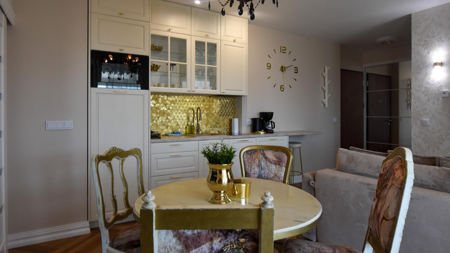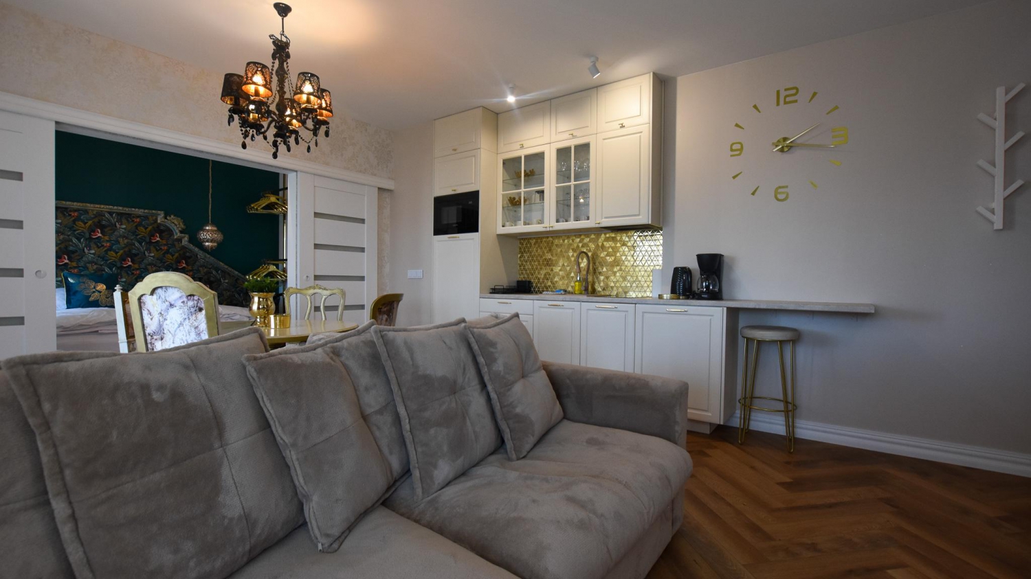 W apartamencie znajduje się także doskonale wyposażony aneks kuchenny przystosowany do zaspokajania codziennych potrzeb. Do dyspozycji naszych Gości udostępniamy sprzęt AGD m.in. lodówkę, kuchenkę, kuchenkę mikrofalową oraz komplet naczyń, sztućce, akcesoria kuchenne, szklanki i kieliszki do wina. Wszystko, co potrzebne by samodzielnie przygotować posiłki i cieszyć się wspólnymi chwilami z bliskimi.