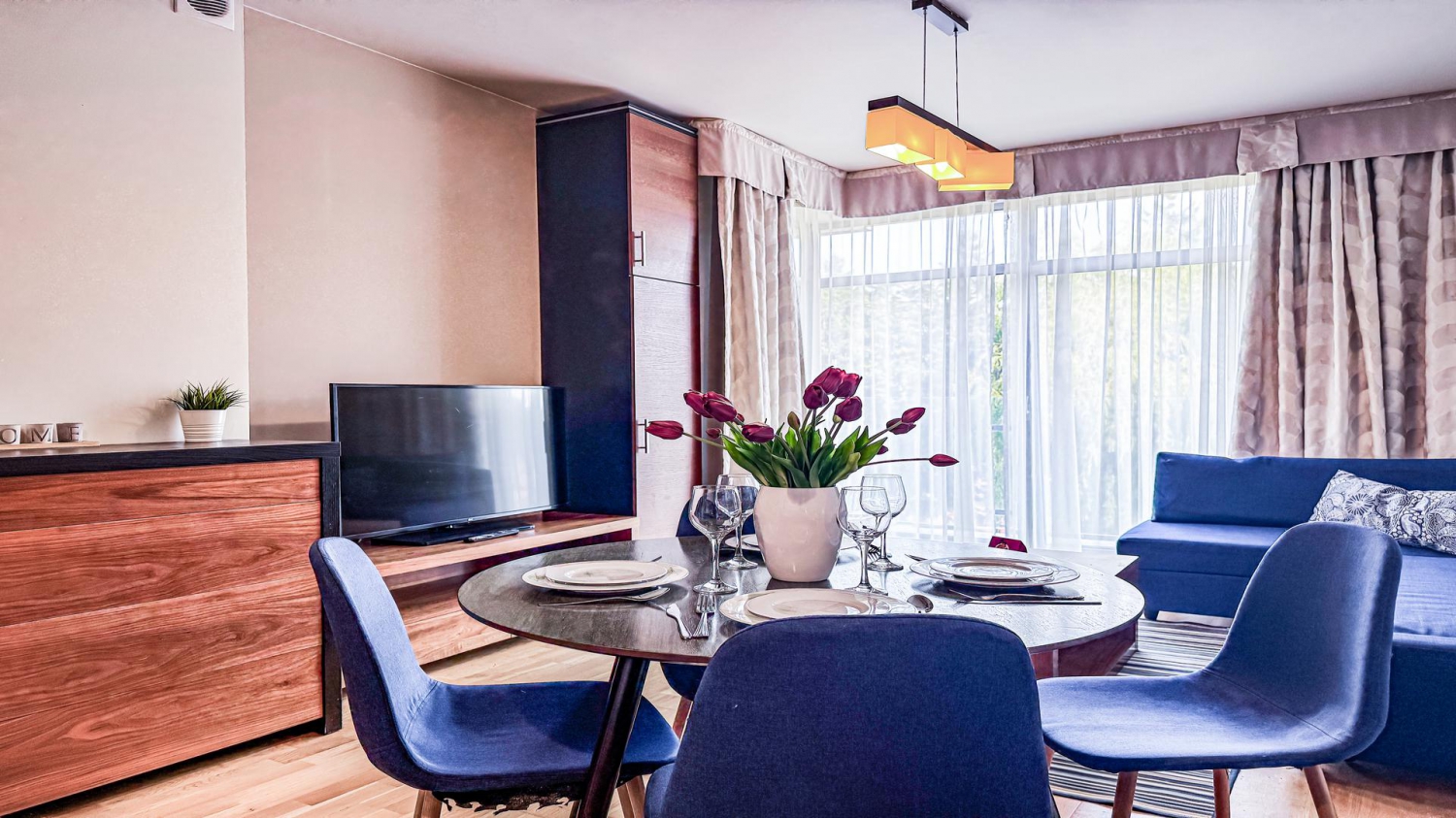 W apartamencie znajduje się także doskonale wyposażony aneks kuchenny przystosowany do zaspokajania codziennych potrzeb. Do dyspozycji naszych Gości udostępniamy nowoczesny sprzęt AGD m.in. lodówkę, kuchenkę z okapem, zmywarkę oraz komplet naczyń, sztućce, akcesoria kuchenne, szklanki i kieliszki do wina. Wszystko, co potrzebne by samodzielnie przygotować posiłki i cieszyć się wspólnymi chwilami z bliskimi.