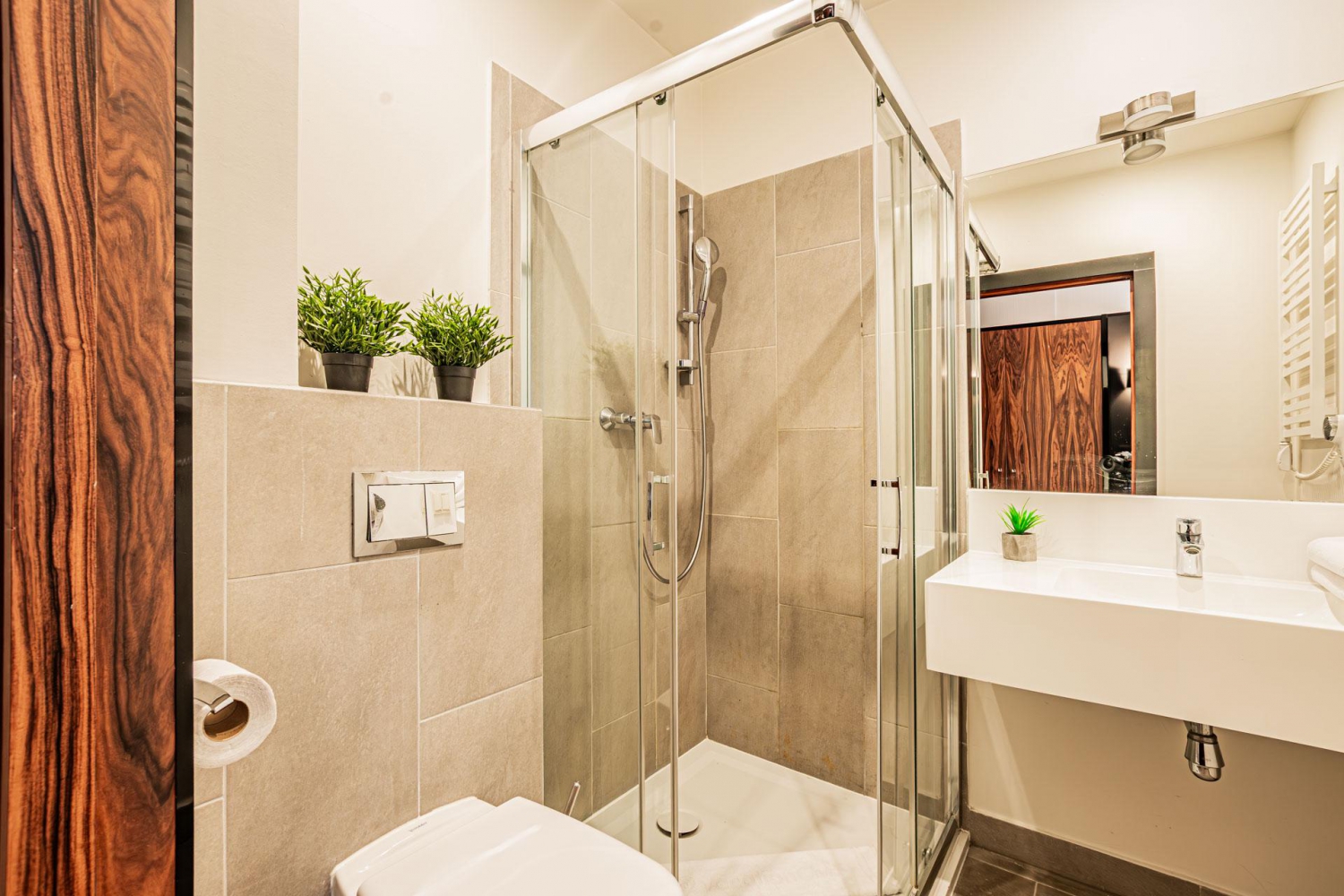 Na Gości czeka salon z dużym łóżkiem małżeńskim oraz łazienka z kabiną prysznicową – idealne warunki na komfortowy wypoczynek nad Bałtykiem.