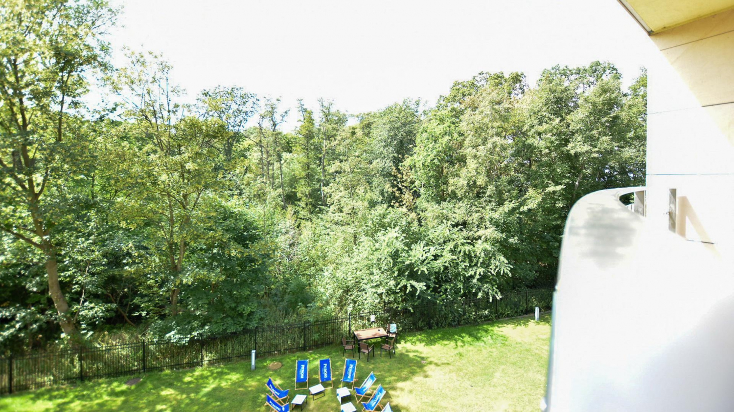 Dużym atutem apartamentu jest słoneczny taras wyposażony w meble ogrodowe – stolik i krzesła. Taras skierowany jest na zachód, co zapewnia widok na park oraz częściowo na morze, a wieczorami pozwala cieszyć się pięknymi zachodami słońca.