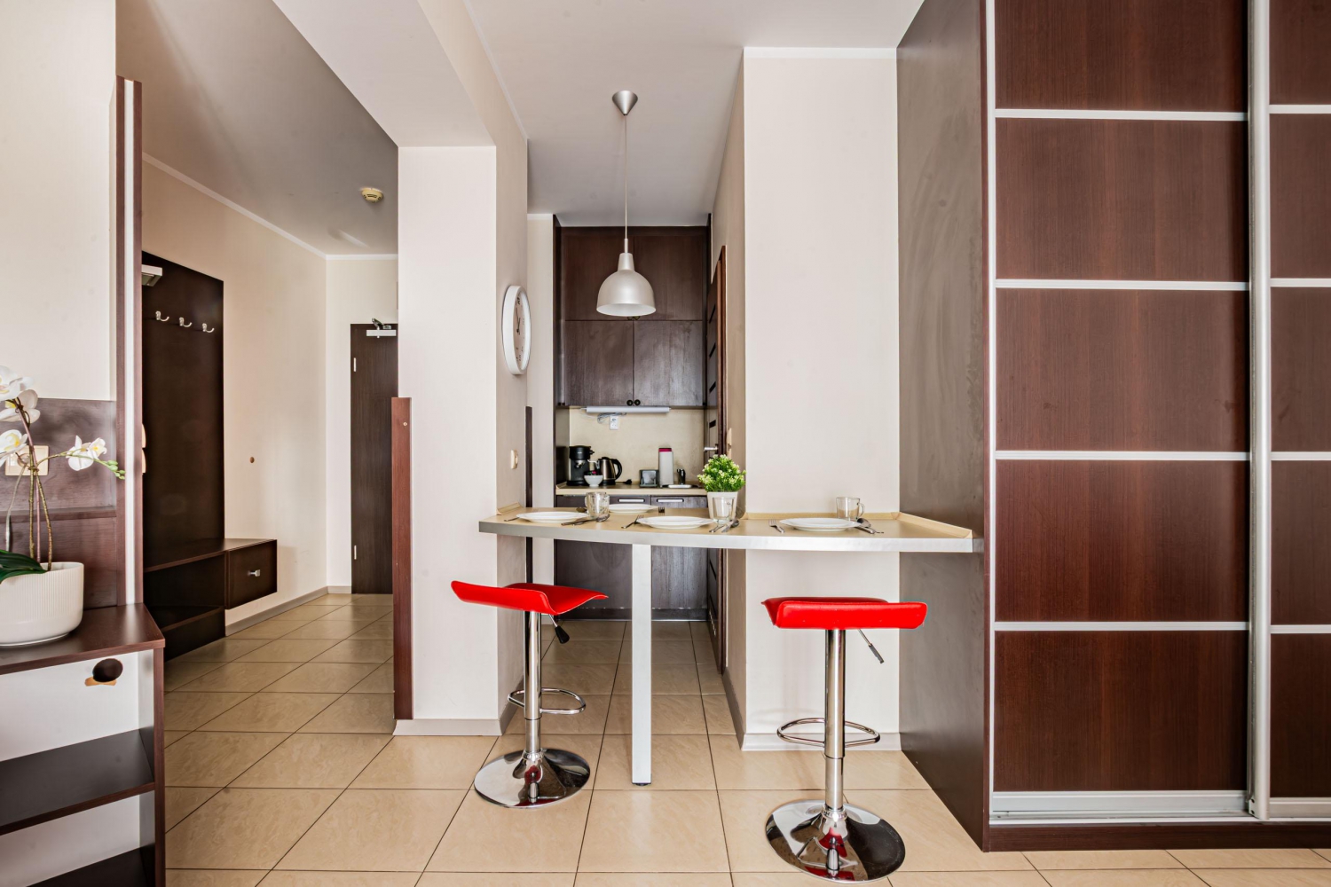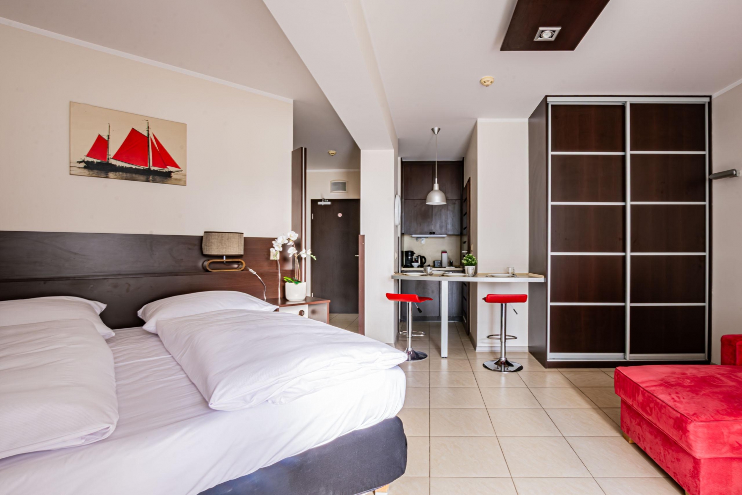 W apartamencie znajduje się doskonale wyposażony aneks kuchenny przystosowany do przygotowywania codziennych posiłków. Do dyspozycji Gości jest sprzęt AGD, m.in. lodówka, czajnik elektryczny, płyta grzewcza oraz ekspres do kawy, a także komplet naczyń, sztućce, akcesoria kuchenne, szklanki i kieliszki do wina. Znaleźć tu można wszystko, co niezbędne, by samodzielnie przygotowywać posiłki i cieszyć się wspólnymi chwilami w gronie rodziny lub znajomych.