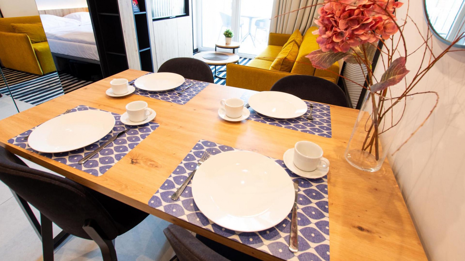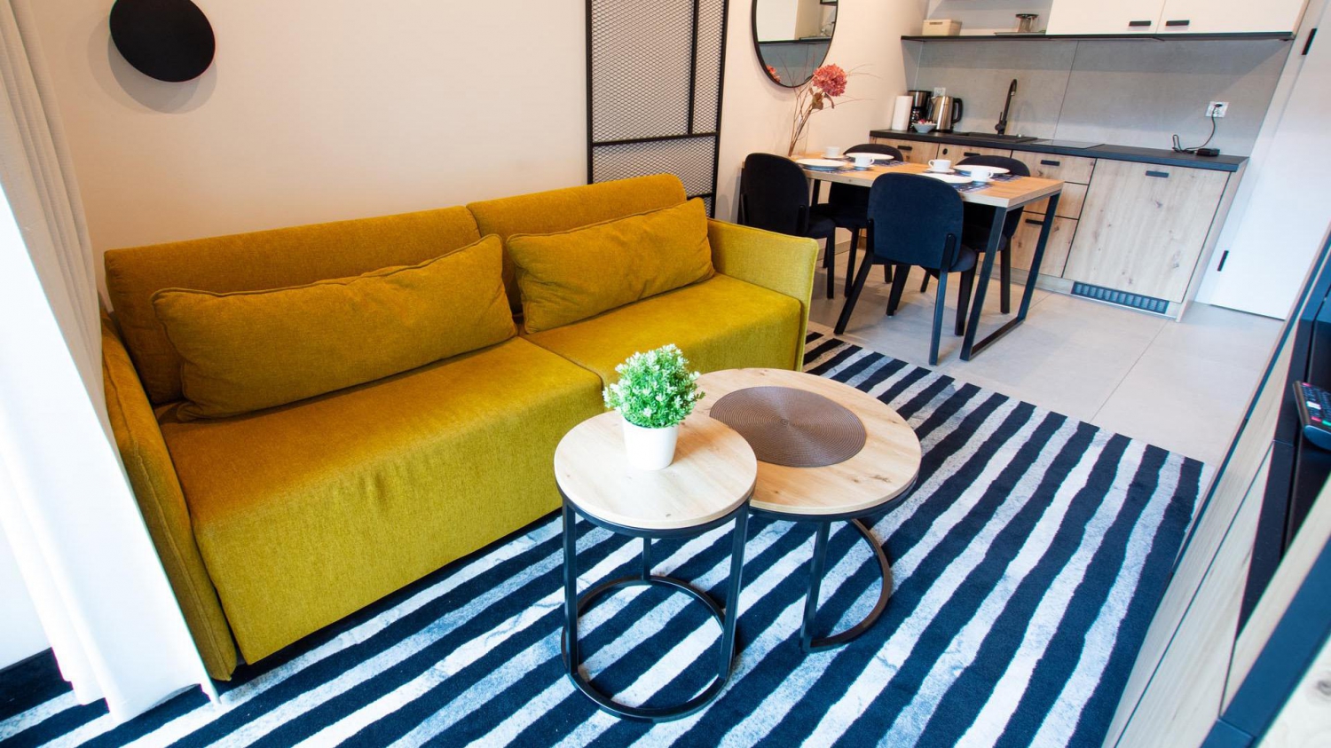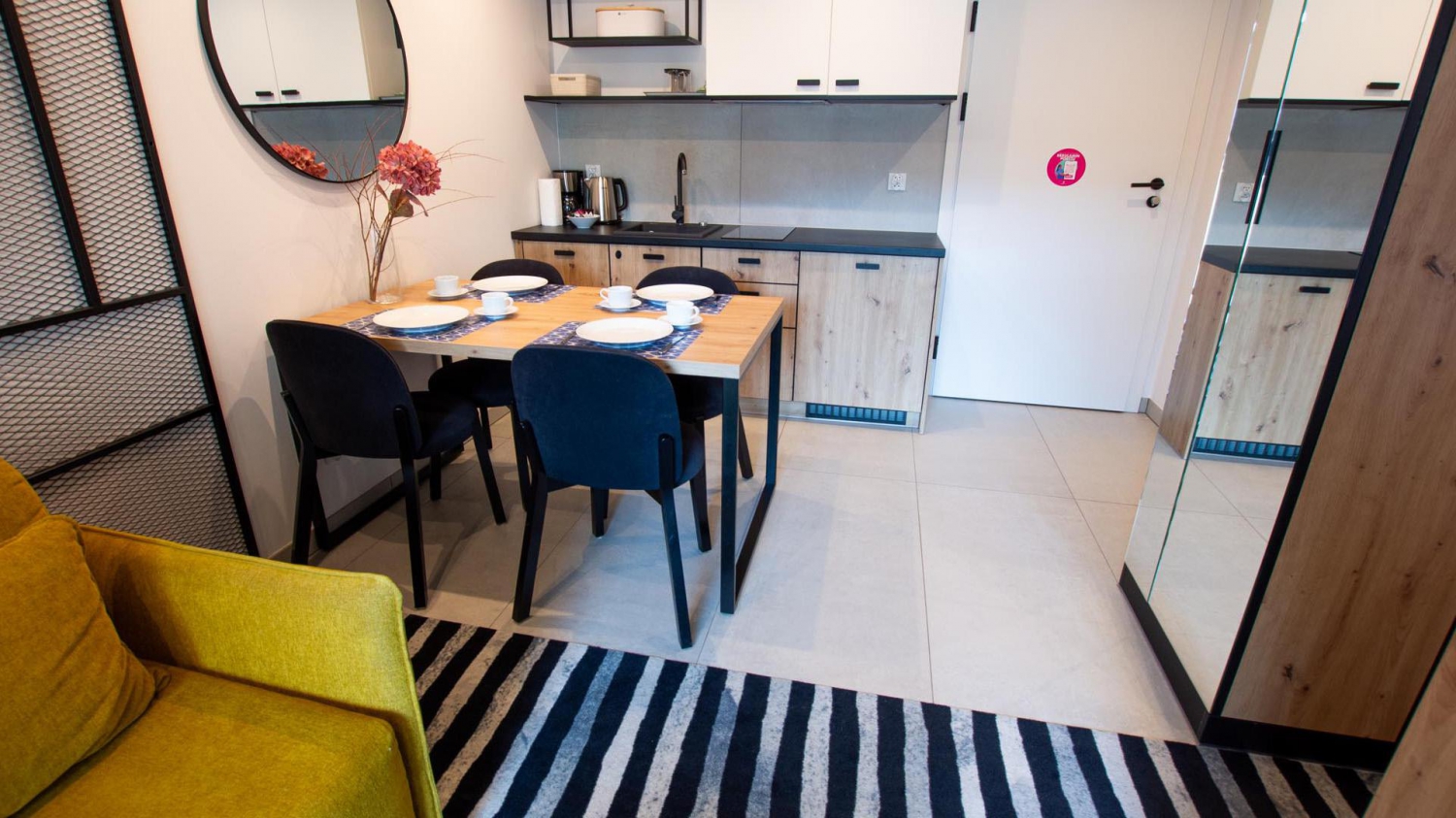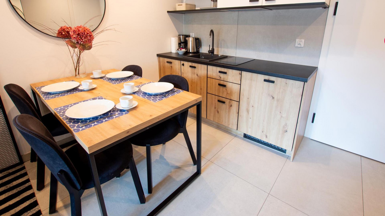 W apartamencie znajduje się doskonale wyposażony aneks kuchenny przystosowany do zaspokajania codziennych potrzeb. Do dyspozycji naszych Gości udostępniamy sprzęt AGD m.in. lodówkę, płytę grzewczą oraz komplet naczyń, sztućce, akcesoria kuchenne, szklanki i kieliszki do wina. Wszystko, co potrzebne by samodzielnie przygotować posiłki i cieszyć się wspólnymi chwilami z bliskimi.