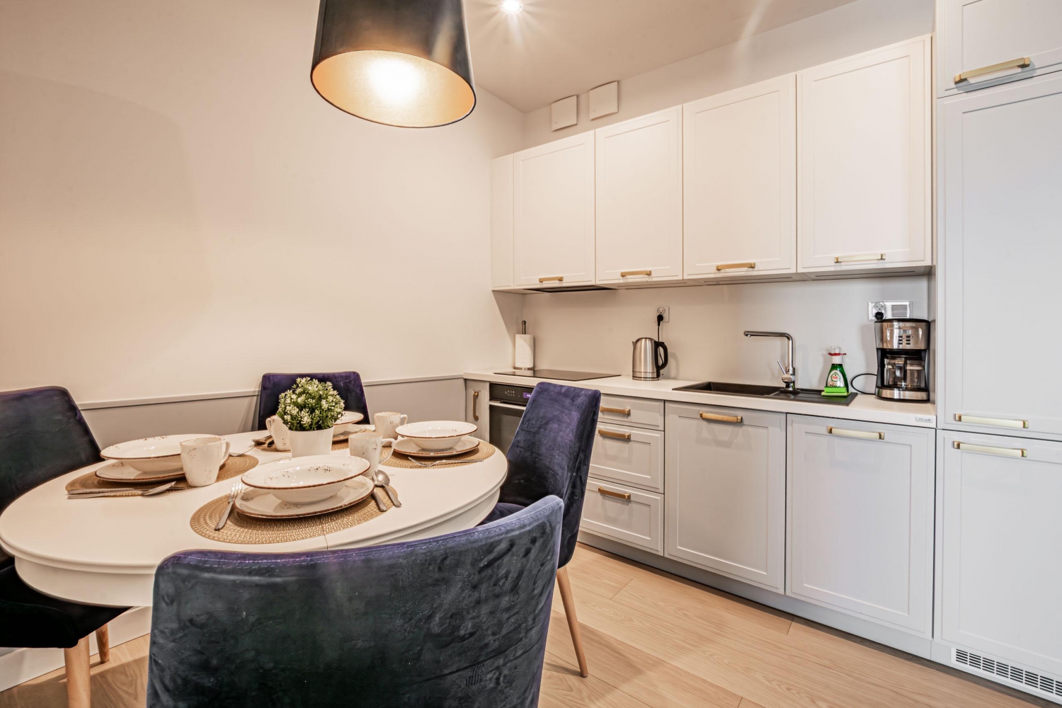 W apartamencie znajduje się doskonale wyposażony aneks kuchenny przystosowany do zaspokajania codziennych potrzeb. Do dyspozycji naszych Gości udostępniamy sprzęt AGD m.in. lodówkę, płytę grzewczą oraz komplet naczyń, sztućce, akcesoria kuchenne, szklanki i kieliszki do wina. Wszystko, co potrzebne by samodzielnie przygotować posiłki i cieszyć się wspólnymi chwilami z bliskimi.