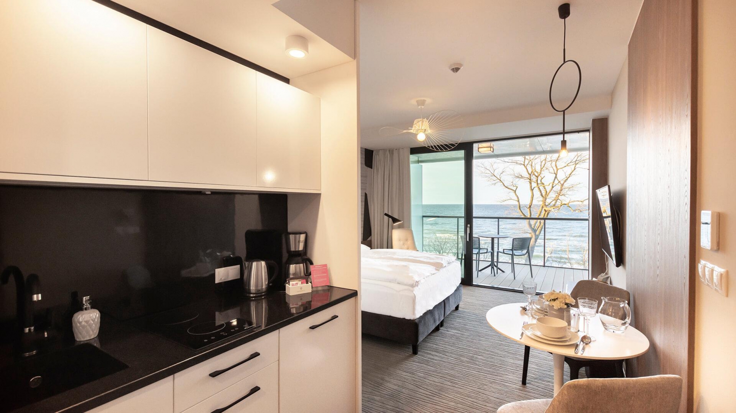 Seaside Park Prywatny Apartament 410 zachwyca designem i wygodą, ale jego największym atutem jest widok na morze. Hotel położony jest w sąsiedztwie Ekoparku oraz w pobliżu zacienionych i niezwykle malowniczych tras rowerowych ̶ do Portu Morskiego i do Podczela. Dogodna lokalizacja apartamentu umożliwia dobry dojazd do dworców – kolejowego i autobusowego.