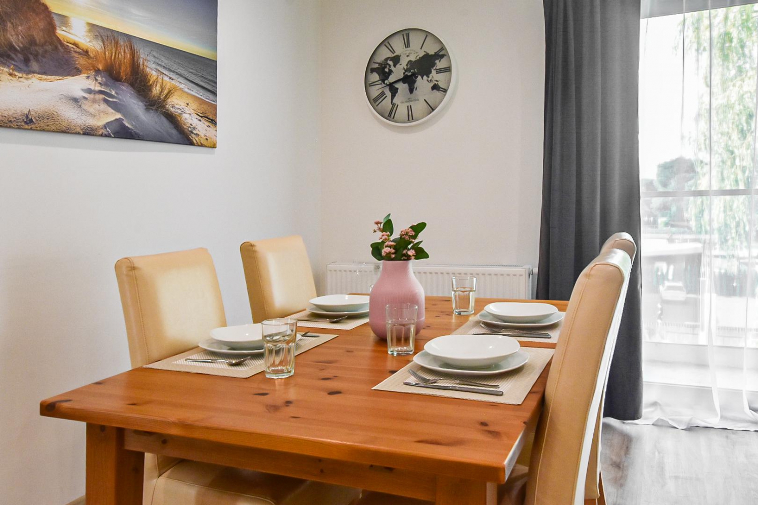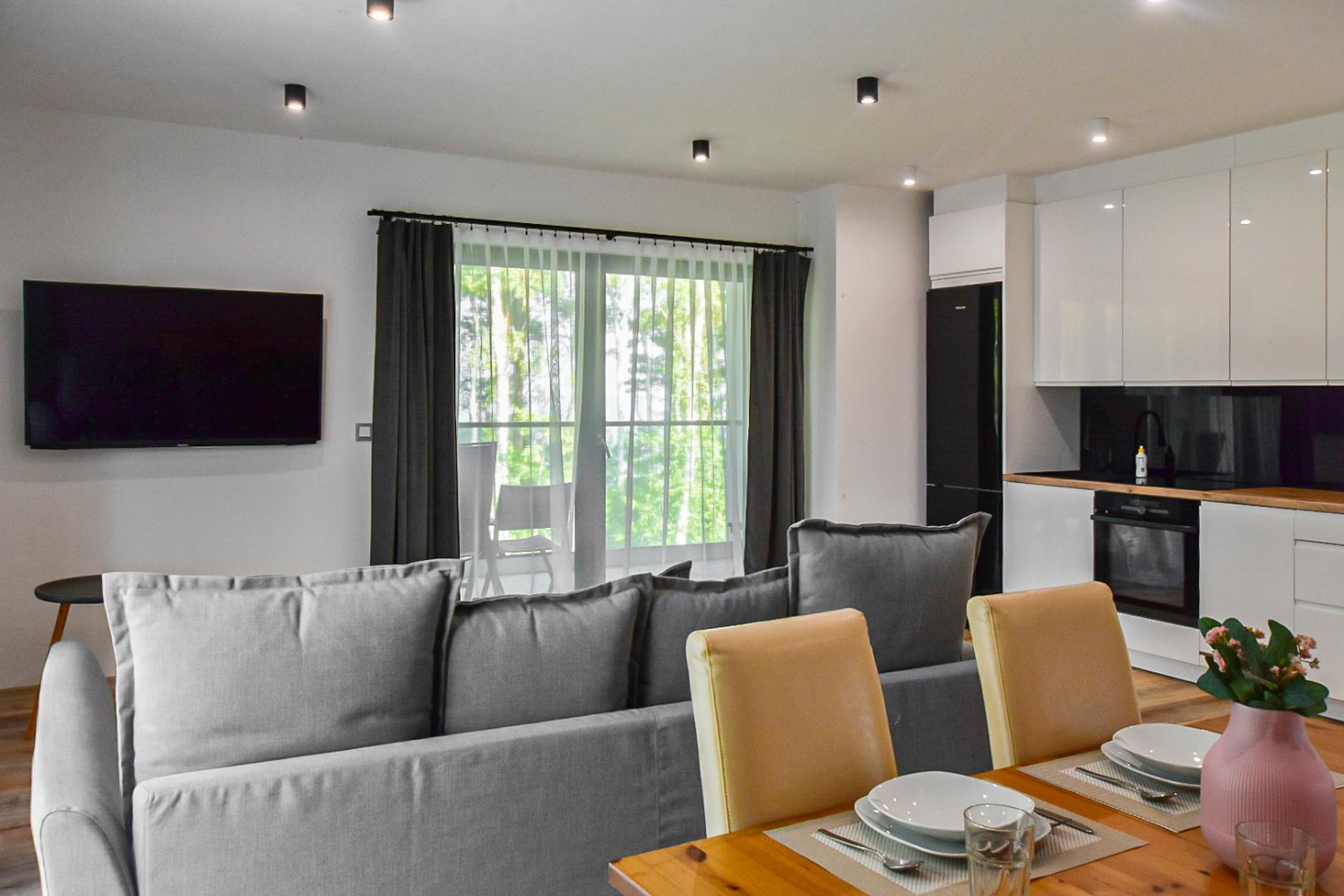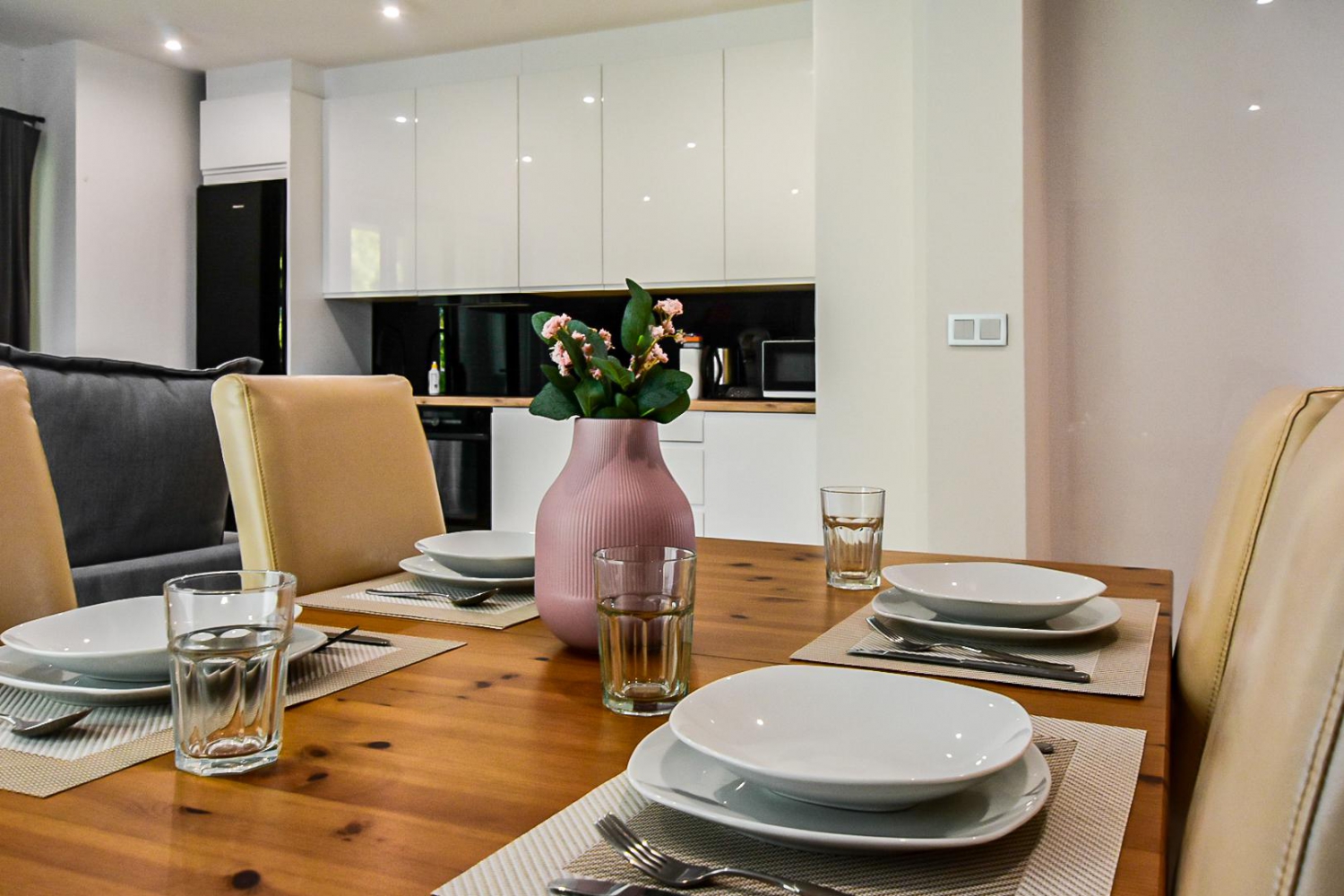 W apartamencie znajduje się aneks kuchenny przystosowany do zaspokajania codziennych potrzeb. Do dyspozycji Gości są sprzęty AGD m.in. lodówka, płyta elektryczna z okapem oraz komplet naczyń, sztućce, akcesoria kuchenne, szklanki i kieliszki do wina. Wszystko, co potrzebne by samodzielnie przygotować posiłki i cieszyć się wspólnymi chwilami z bliskimi.