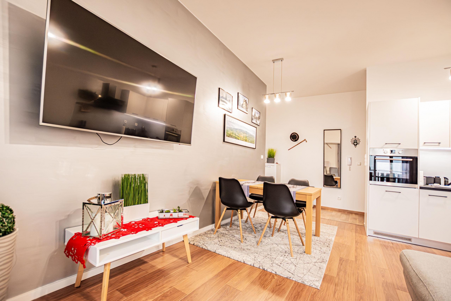 W apartamencie znajduje się także doskonale wyposażony aneks kuchenny przystosowany do zaspokajania codziennych potrzeb. Do dyspozycji naszych Gości udostępniamy sprzęt AGD m.in. lodówkę, kuchenkę, piekarnik, ekspres do kawy oraz komplet naczyń, sztućce, akcesoria kuchenne, szklanki i kieliszki do wina. Wszystko, co potrzebne by samodzielnie przygotować posiłki i cieszyć się wspólnymi chwilami z bliskimi.