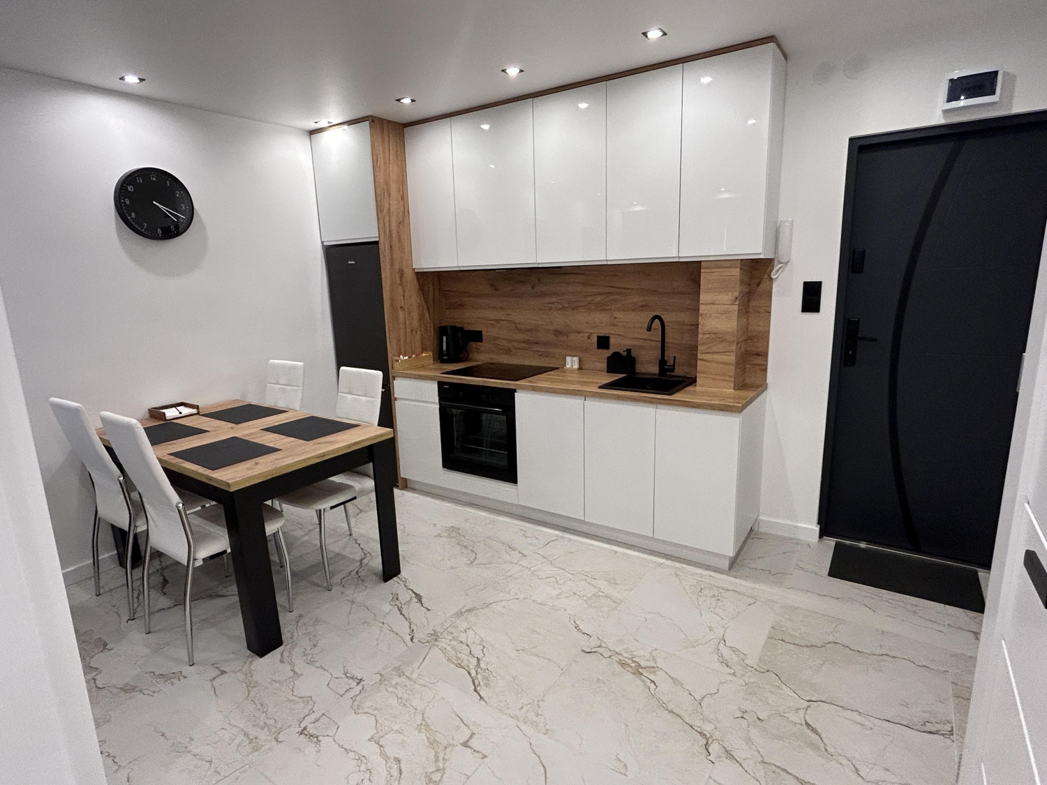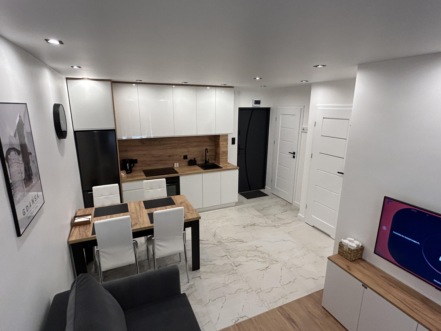 Nowoczesny aneks kuchenny został zaprojektowany z myślą o komforcie i pełnej wygodzie Gości. To doskonale wyposażona przestrzeń- do dyspozycji Gości jest lodówka, płyta indukcyjna, piekarnik, zmywarka oraz komplet naczyń, sztućców i szklanek. Wnętrze utrzymane jest w jasnych barwach i nowoczesnym stylu, z funkcjonalnym układem i dużą ilością miejsca do przechowywania. Aneks kuchenny stanowi integralną część przestronnego salonu, dzięki czemu sprzyja wspólnemu spędzaniu czasu w domowej, przytulnej atmosferze.