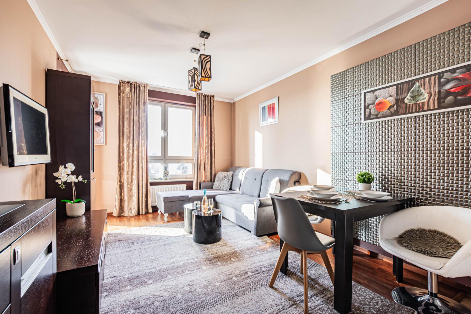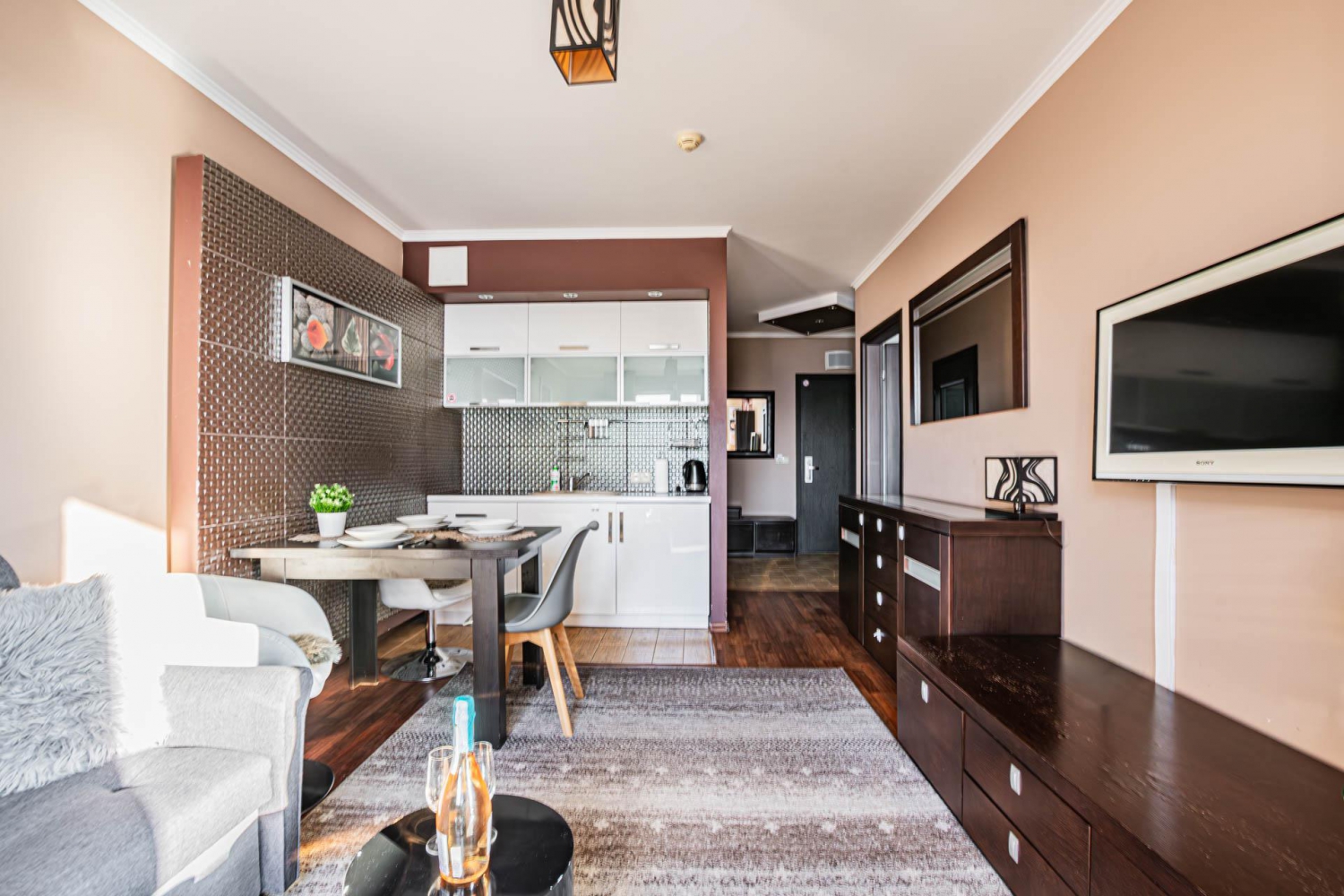 W apartamencie znajduje się profesjonalnie wyposażony aneks kuchenny przygotowany do spędzania wspólnych chwil w gronie rodziny i przyjaciół. Lodówka, płyta grzewcza wraz kompletem naczyń, sztućców, akcesoriami kuchennymi, szklankami i kieliszkami umożliwiają samodzielne przygotowanie posiłków wspólnie z bliskimi.