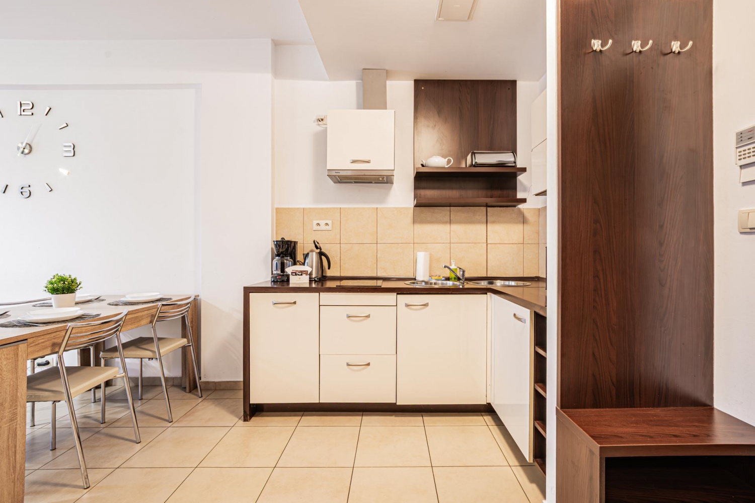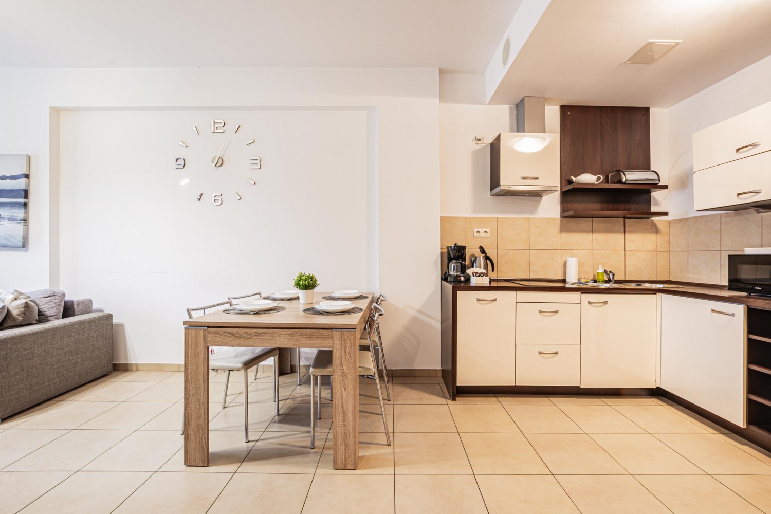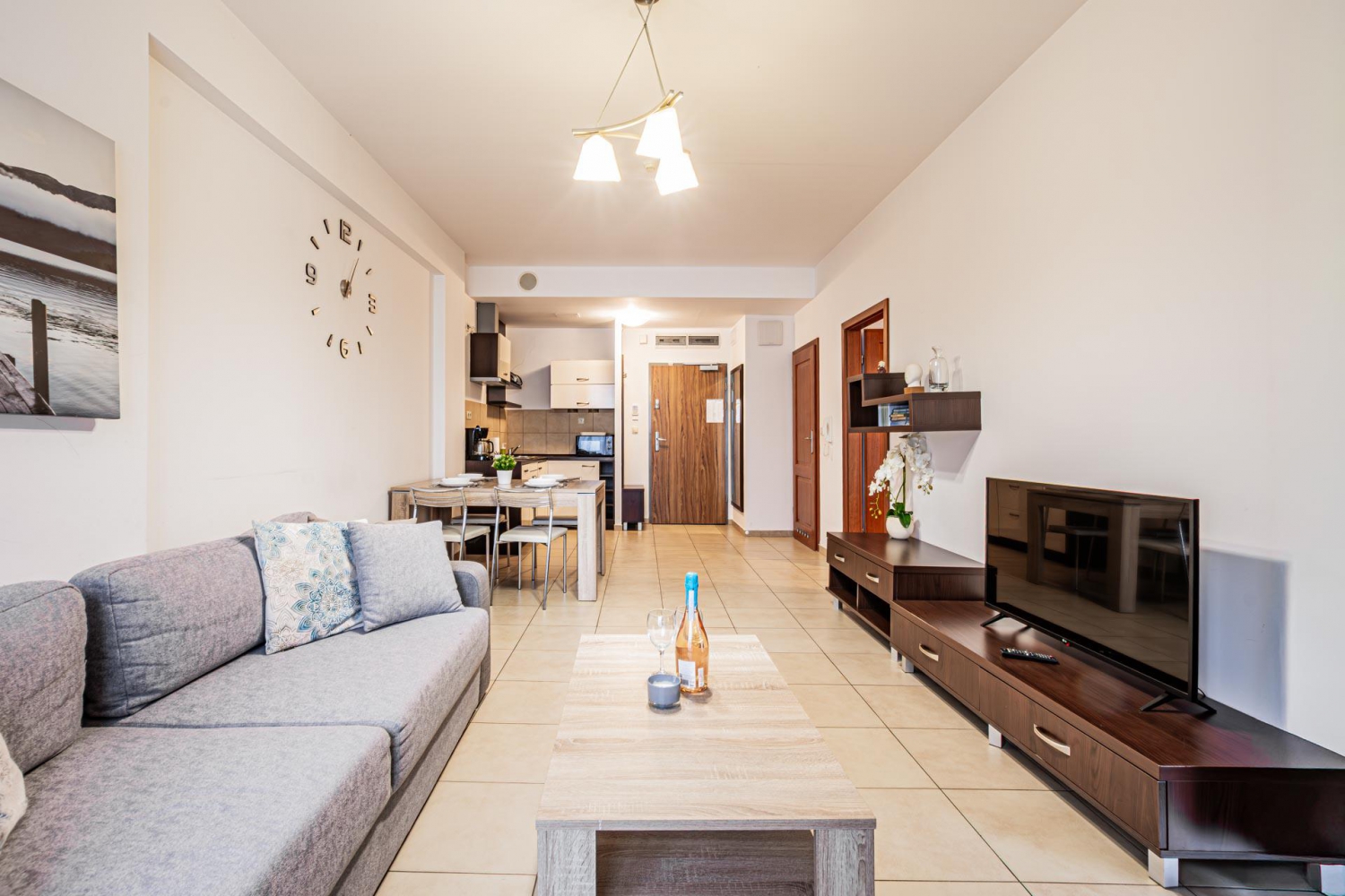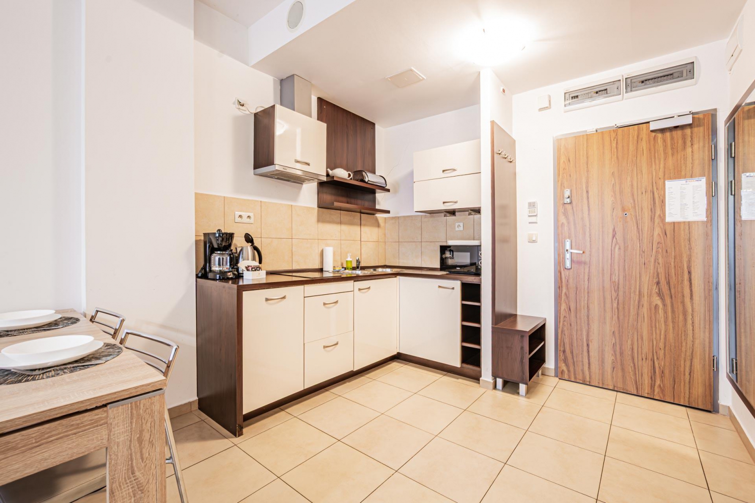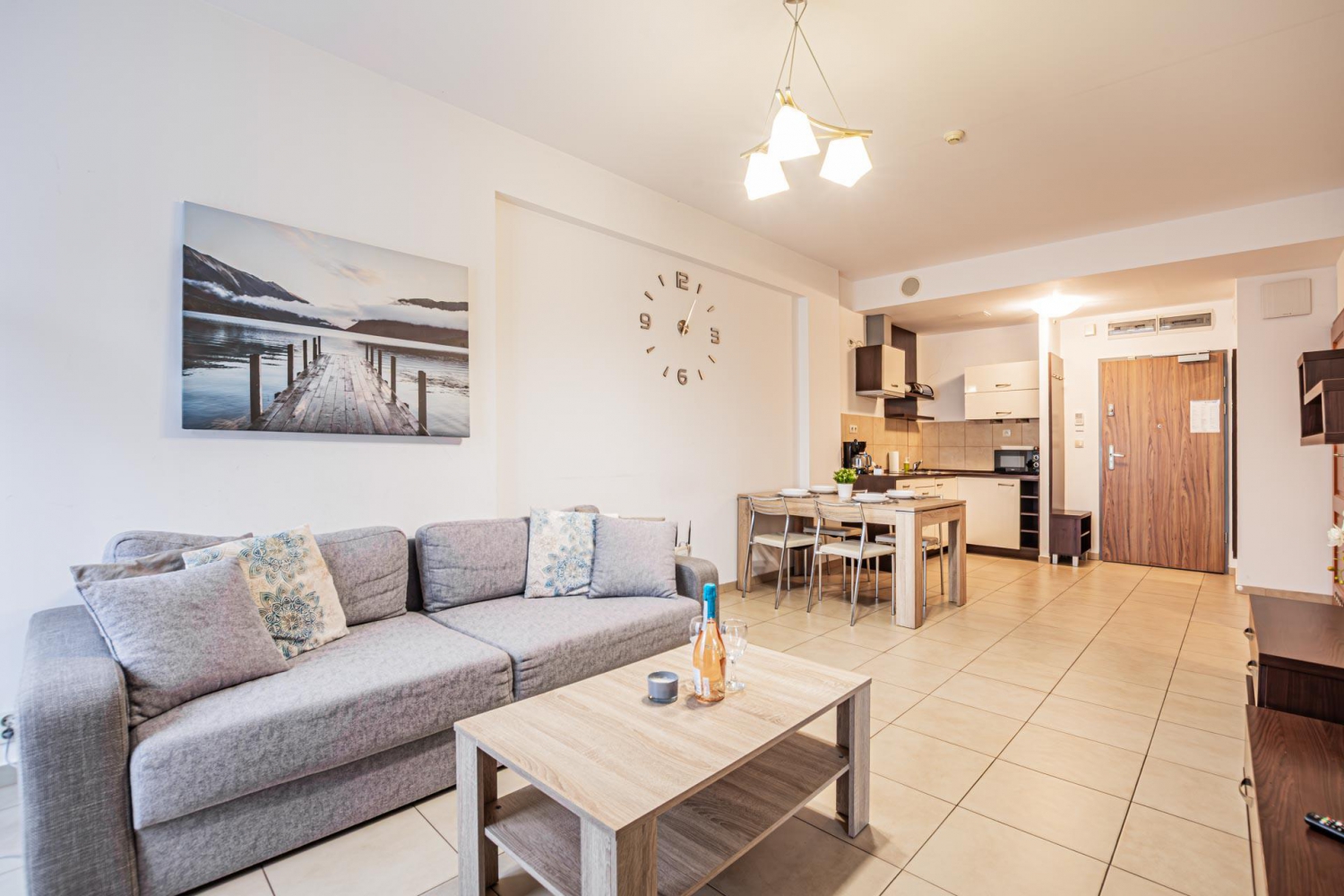 W apartamencie znajduje się doskonale wyposażony aneks kuchenny przystosowany do zaspokajania codziennych potrzeb. Do dyspozycji Gości są sprzęty AGD m.in. lodówka, zmywarka, płyta indukcyjna, mikrofala oraz komplet naczyń, sztućce, akcesoria kuchenne, szklanki i kieliszki do wina. Wszystko, co potrzebne by samodzielnie przygotować posiłki i cieszyć się wspólnymi chwilami z bliskimi.