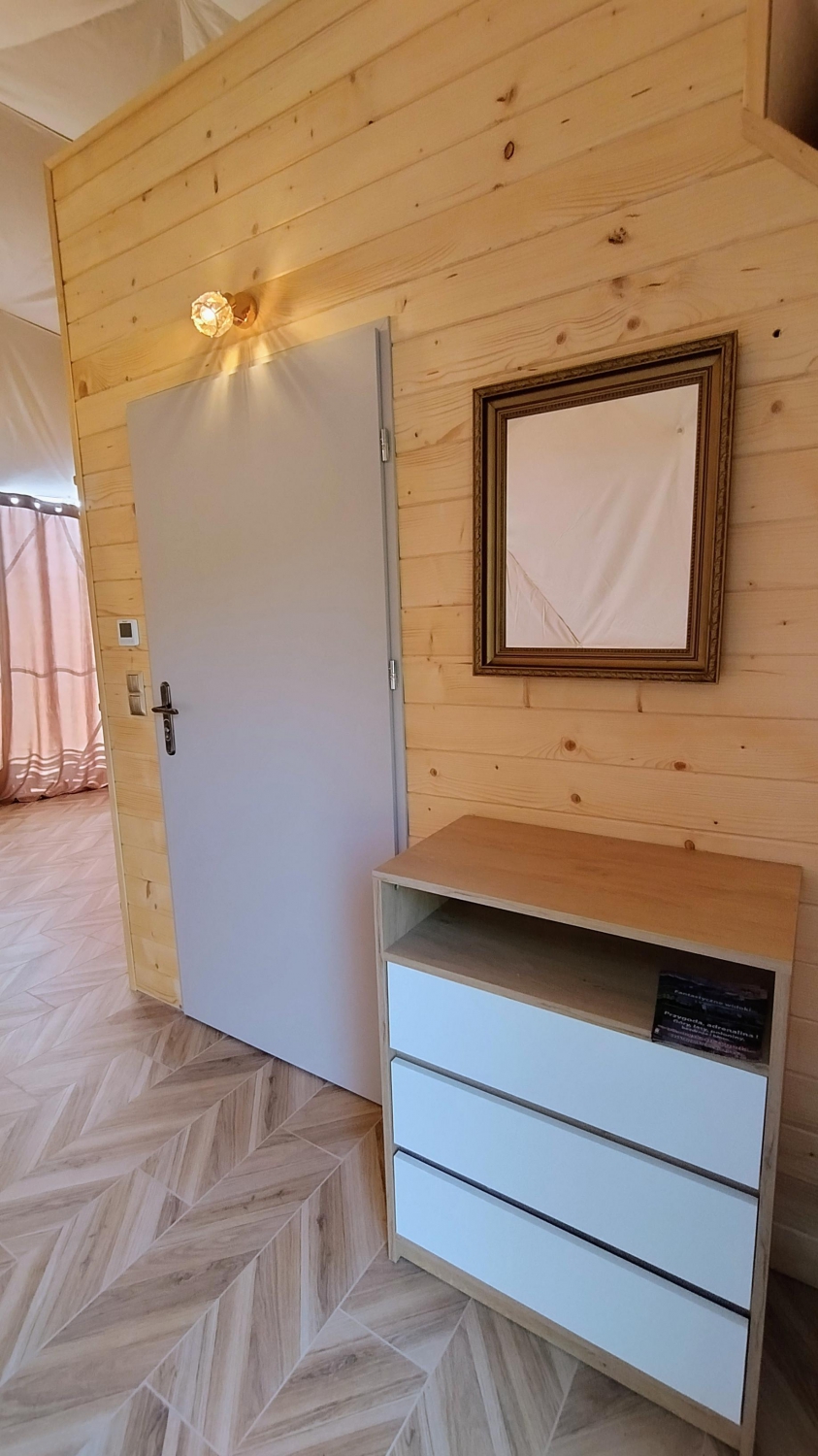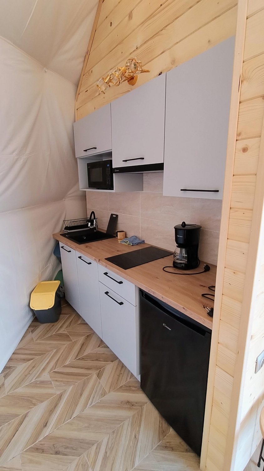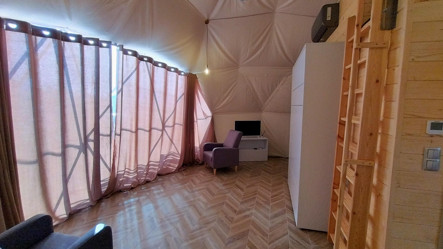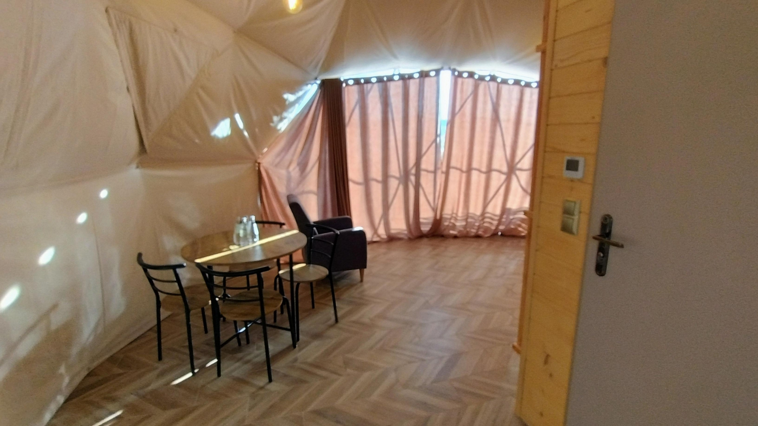 Budynek ma formę nowoczesnego, całorocznego namiotu glampingowego w kształcie kopuły, zaprojektowanego z myślą o komforcie, estetyce i bliskości natury. Konstrukcja o powierzchni 35 m² stanowi samodzielny, niezależny obiekt, zapewniający gościom prywatność i kameralną atmosferę. Namiot posiada własne wejście, prywatną łazienkę oraz w pełni wyposażony aneks kuchenny. Został przystosowany do całorocznego użytkowania – wyposażony w klimatyzację, ogrzewanie podłogowe oraz wentylację solarną, co gwarantuje komfort zarówno w sezonie letnim, jak i zimowym.Obiekt oferowany jest w formule pobytów minimum dwudobowych, co sprzyja pełnemu wypoczynkowi i regeneracji. Nowoczesna forma kopuły w połączeniu z funkcjonalnym wnętrzem tworzy wyjątkową przestrzeń do wypoczynku blisko natury.
